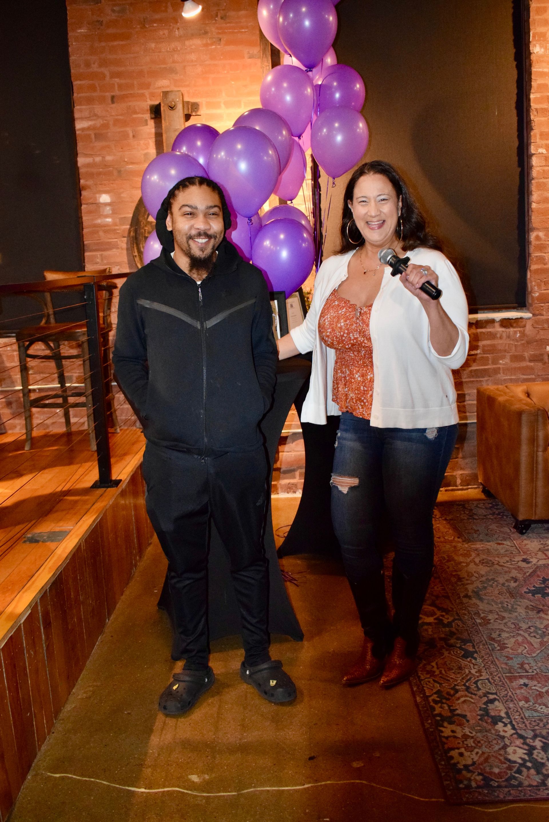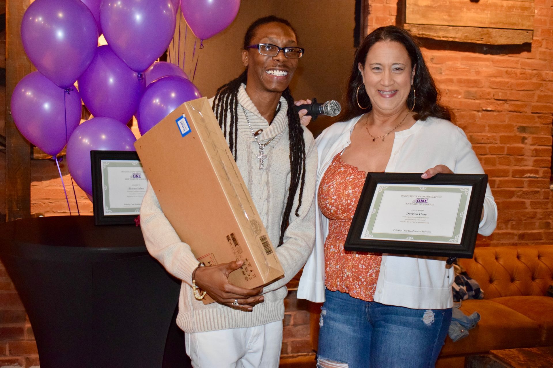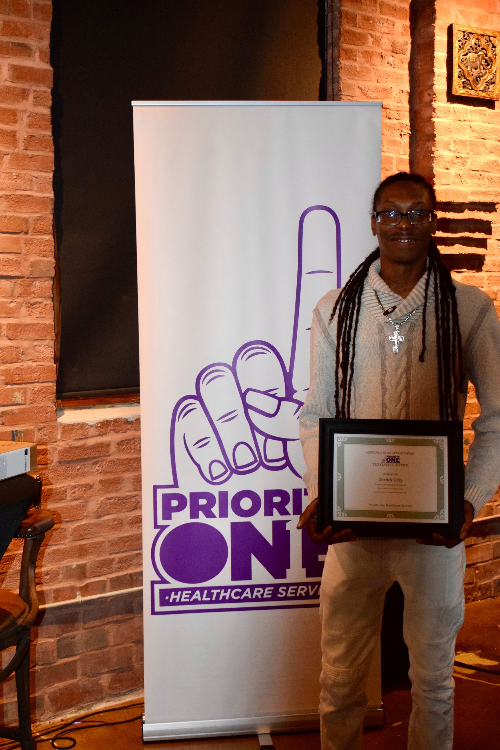 A Man Is Holding Two Certificates in Front of A Purple Wall.
