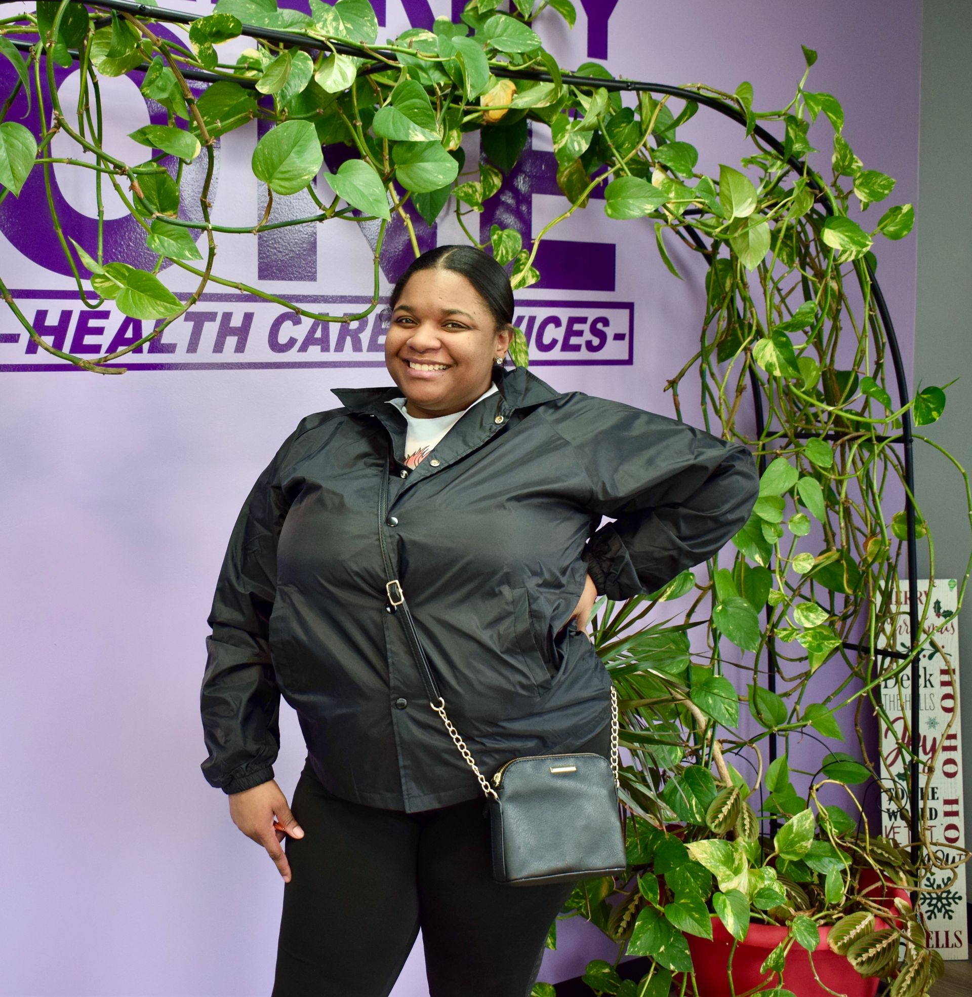 A Woman Is Standing in Front of A Sign that Says Health Care Services